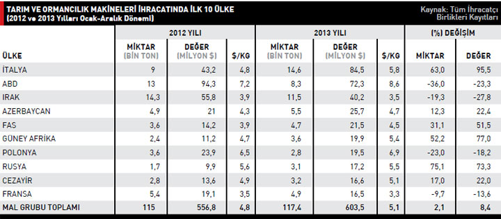 Tarım ve ormancılıkta kullanılan makineler, aksam ve parçaları ürün grubunda 2013 yılı Ocak-Aralık döneminde gerçekleştirilen ihracatın değeri 603,5 milyon dolar oldu. 2012 yılının aynı döneminde bu rakam 556,8 milyon dolardı. Tarım ve ormancılıkta kullanılan makineler, aksam ve parçaları ürün grubunda yaşanan ihracat artışı yüzde 8,4 oldu. 2013 yılı Ocak- Aralık döneminde tarım ve ormancılıkta kullanılan makineler, aksam ve parçaları kaleminde en fazla ihracat İtalya’ya gerçekleştirildi. Bir önceki yıla oranla yüzde 95,5 ihracat artışının yaşandığı İtalya’ya 2012 yılının Ocak-Aralık döneminde 43,2 milyon dolar ihracat değerine sahip ürün gönderilirken bu rakam, 2013 yılının aynı döneminde 84,5 milyon dolara yükseldi. Listenin ikinci sırasında yer alan ABD’ye 2013 yılının Ocak- Aralık döneminde 72,3 milyon dolarlık ihracat gerçekleştirildi. Üçüncü sırada bulunan Irak’a 2013 yılının Ocak- Aralık döneminde ihraç edilen tarım ve ormancılıkta kullanılan makineler, aksam ve parçalarının değeri 40,2 milyon dolar oldu. Dördüncü sıradaki Azerbaycan’a 2012 yılının Ocak- Aralık döneminde 21 milyon dolarlık ürün ihraç edilirken bu rakam, yüzde 22,4 artışla 2013 yılının aynı döneminde 25,7 milyon dolar değerine yükseldi. Beşinci sıradaki Fas’a 2013 yılının Ocak- Aralık döneminde ihraç edilen tarım ve ormancılıkta kullanılan makineler, aksam ve parçalarının toplam değeri 21,5 milyon dolar oldu. 2012 yılının aynı döneminde söz konusu ülkeye gönderilen ürünlerin değeri 14,2 milyon dolar seviyesindeydi. Fas’a yönelik ihracat artışı yüzde 51,5 olarak kaydedildi. Tarım ve ormancılıkta kullanılan makineler, aksam ve parçaları ürün grubunda ihracat artışının en fazla yaşandığı ilk üç ülke sıralamasında ise yüzde 95,5 ile İtalya ilk sırada yer alırken yüzde 77 ile Güney Afrika Cumhuriyeti ikinci ve yüzde 73,3 ihracat artışıyla da Rusya üçüncü oldu.
