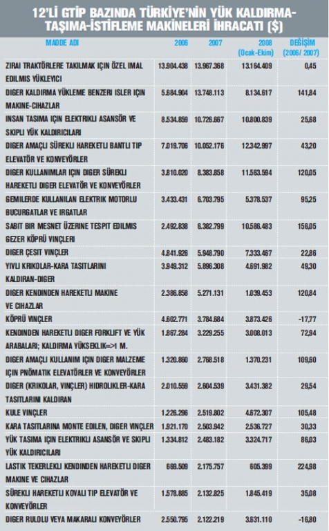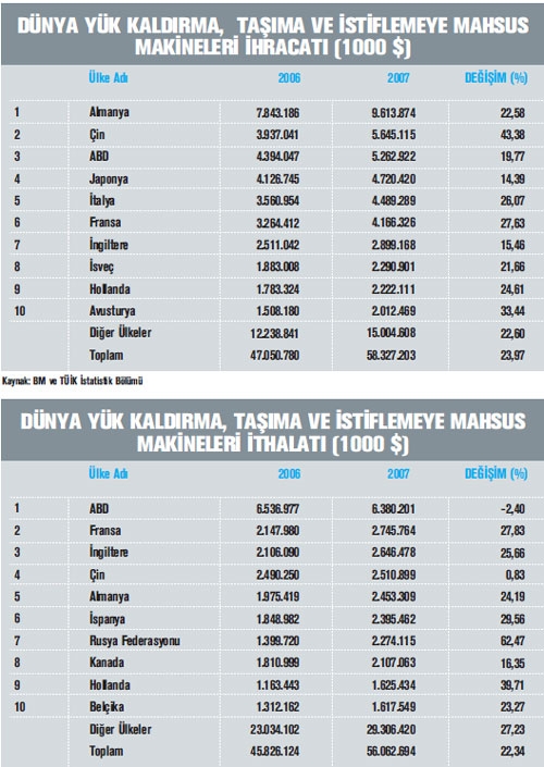 BU SEKTORDE DE CİN DUNYAYA MEYDAN OKUYOR Birleşmiş Milletler (BM) İstatistik Bölü mü verilerine göre 2007 yılında yük kaldırma, taşıma ve istişeme makineleri sektörü toplam ihracatı, bir önceki yıla göre yüzde 24 oranında artış göstererek 58 milyar dolar değerini aşmış durumda. Dünya yük kaldırma, taşıma ve istişeme makineleri ihracatında ilk sırada Almanya yer alıyor. Bu ülkeyi Çin ve ABD takip ediyor. Türkiye ise 2007 yılında sektör ihracatında 35. sırada yer aldı. Yük kaldırma, taşıma ve istişeme makineleri ihracatı yapan ilk 10 ülke arasında en fazla ihracat artışı yüzde 43 ile Çin’de gözlendi. Söz konusu ülkenin dünya sektör ihracatı içerisindeki payı yüzde 9,7 düzeyine yükseldi.