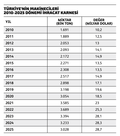 TÜRK MAKİNE SEKTÖRÜ, ZORLUKLARLA DOLU 2025’İ DE KAYIPSIZ GEÇMEYİ BAŞARDI. MAKİNE İHRACATINI YÜZDE 1,9 ARTIŞLA 28,7 MİLYAR DOLARA TAŞIYAN TÜRKİYE’NİN MAKİNECİLERİ, TONAJ OLARAK YÜZDE 6,3’E ULAŞAN KAYBINI, İHRACAT KİLOGRAM DEĞERİNİ 8,1 DOLARLIK REKOR DÜZEYE ULAŞTIRARAK KARŞILADI.