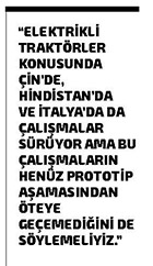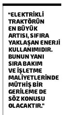 TRAKTÖRLERDE DİZEL MOTOR TEKNOLOJİSİNDEN ELEKTRİKLİYE GEÇİŞTE, TEKNOLOJİNİN İLERLEME HIZI SÜREÇ İÇİN BELİRLEYİCİ OLACAK. MOTORDA İHTİYAÇ DUYULAN TEKNİK GEREKLİLİKLERİN SAĞLANABİLMESİ VE BATARYA TEKNOLOJİNİN GELİŞMESİ BU GEÇİŞİN ZAMANLAMASINI BELİRLEYECEK. TABİİ, BURADA ASIL ÖNEMLİ SORULAR ŞUNLAR: “BİZ BU İŞİN NERESİNDE YER ALACAĞIZ? AKTÖR MÜ OLACAĞIZ YOKSA SEYİRCİ Mİ KALACAĞIZ? DEVRİM ARABALARI GİBİ AMA SONU İYİ BİTEN BİR BAŞARI HİKÂYESİ Mİ YAZACAĞIZ YOKSA BİR BAŞKA BAHARI MI BEKLEYECEĞİZ?” İŞTE BU YÜZDEN, NE ZAMAN TİCARİLEŞECEĞİNE BAKILMAKSIZIN, ÇALIŞMALARA HEMEN BAŞLANILMASINI ÇOK ÖNEMSİYORUM.