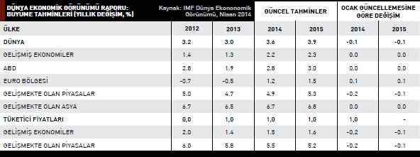 Bu konuda en temel kaynaklardan biri, güncellemeleriyle birlikte yılda dört kez yayınlanan IMF’nin Küresel Ekonomik Görünüm Raporu’dur. En son Nisan ayı başında yayınlanan rapora göre IMF küresel ekonominin 2014 yılında yüzde 3,6; 2015 yılında ise yüzde 3,9 oranında büyüyeceğini tahmin ediyor (Tablo 1). Büyümenin 2013 yılında yüzde 3 düzeylerine kadar gerilediği düşünülecek olduğunda büyümede bir ivmelenme söz konusu; raporun bir öncekilere göre daha iyimser bir ton taşıdığını da eklemek lazım. Örneğin, dünya ekonomisinin yeni bir resesyona girme olasılığı hemen her raporda telaffuz edilen bir riskken (hatırlarsak 2009’da dünya ekonomisi nadir görülen bir daralma yaşamıştı), artık bu riskten bahsedilmiyor. Ama büyüme halen istenen düzeyde ve güçte değil. Aynı zamanda ülke veya bölgesel bazda farklılıklar oldukça büyük. Ancak son yılların aksine, toparlanmada gelişmiş ülkeler (GE) ön plana çıkarken, gelişmekte olan ekonomilerde (GOE) ivme kaybı var. Yine de gelir düzeyleri ve yapısal özellikleri göz önünde bulundurulduğunda büyüme GOE’lerde, özellikle de Asya ekonomilerinde, daha yüksek. Gelişmiş ülkelerde yaşanan toparlanmada ise ABD öne çıkıyor. Üretim ve tüketimde yaşanan toparlanma ile konut sektöründeki ivmelenme işaretlerine, para politikasında normalleşme eşlik ediyor. İstihdam piyasasında iyileşme sürüyor ama yavaş; ayrıca enflasyonda hedeflenen yüzde 2’lik seviyeye ulaşmakta sıkıntılar devam ediyor. Euro Bölgesi’nde (EB) toparlanma bir nebze daha belirgin hale geldi, artık büyüme pozitif bölgeye geçti. Euro Bölgesi’nde, özellikle ‘perifer’ tabir edilen güney tarafında (İtalya, İspanya, Yunanistan ve Portekiz) büyüme ibresinin yönünü hafif de olsa yukarı çevirmesi bardağın dolu tarafı; ancak yüksek işsizlikle beraber halen zayıf seyreden talep tarafı ve özellikle artık belirginlik kazanan ve Avrupa Merkez Bankasının (AMB) harekete geçmesi beklentilerini doğuran deflasyon -veya düşük enflasyon (lowflation)- tehlikesi bölgenin temel sorunları olmaya devam ediyor. Japonya’da ‘Abenomics’in ekonomide umut veren “kıpırdanmalar” yarattığı görülüyor, ancak iç talebin canlandırılması açısından son vergi artışları ve ücretlerin yeterli oranda artmaması soru işaretleri yaratıyor. Özellikle uzun tartışmaların ardından 1 Nisan itibariyle yürürlüğe giren ve KDV oranlarını yüzde 5’ten yüzde 8’e taşıyan artışların tüketici güveninde sert etkilerinin görülmeye başlaması endişeleri artırıyor. Hatırlanacak olursa Abenomics 3 bacaktan oluşuyor -parasal genişleme, mali tarafta çeki düzen ve yapısal reformlar. Parasal tarafta teşvikler devam ederken, özellikle yapısal reformlar yavaş ilerliyor.