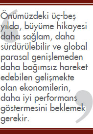 Önümüzdeki üç-beş yılda, büyüme hikayesi daha sağlam, daha sürdürülebilir ve global parasal genişlemeden daha bağımsız hareket edebilen GOE’lerin, daha iyi performans göstermesini beklemek gerekir. Örneğin, bizim gibi büyüme hikayesi cari açıkla çok bağlantılı olan ülkeler biraz daha zorlanabilir; siyasi istikrarı, reform çizgisini ve yapısal değişimini belli bir çizgiye oturtmuş ekonomiler ise daha fazla yatırım çeker. Yapılan bazı çalışmalar özellikle global kriz sonrası dönemde GOE’lere gelen sermayenin, GOE’lerin kendi temellerinden çok, likiditenin bol olmasından kaynaklandığını gösteriyor. Bunu tersten okursak, önümüzdeki dönemde daha zorlu bir görünüm ile karşı karşıyayız; kendi hikayesini kuvvetlendiren ekonomiler daha iyi performans gösterecek anlamına geliyor bu. Burada önemli başka bir konu, global ekonomiye nasıl bağlı olunduğuyla ilgili. GE’lerin büyüme görünümü iyileştikçe ihracata dönük ekonomiler bundan olumlu etkilenecek, ama büyümeden dolayı para politikası normalleştikçe finansman tarafında daha bağımlı ülkeler zorlanacak. IMF tarafından yapılan son bir çalışma, örneğin, GE büyümesinin GOE’ler üzerindeki net etkisini pozitif buluyor; ama tabi ki bu ülkeden ülkeye -hangi etkenin ülke için daha önemli olduğuna göre- farklılık gösterebiliyor. Bu anlamda GE’lerden gelen ihracat talebindeki artışı değerlendirmeyi sağlayan, ama bir yandan da (azalan likiditenin olumsuz etkilerini azaltmak anlamında) dış finansman bağımlılığını hafifleten reformlara ve politikalara ağırlık vermek gerekiyor.