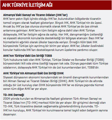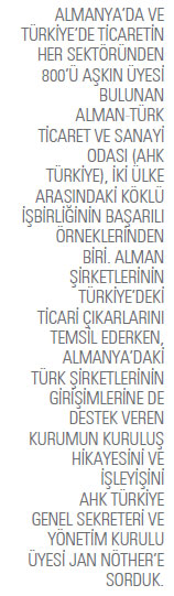 160 yıldır yakın işbirliği içinde olan Almanya ve Türkiye şirketlerinin bir araya geldiği Alman-Türk Ticaret ve Sanayi Odası (AHK Türkiye) iki ülkenin ekonomik ilişkilerini her geçen gün biraz daha pekiştiriyor. Türkiye ya da Almanya pazarına girmek isteyen şirketlerin çalışmalarını başarılı şekilde yürütebilmeleri ve piyasada başarı kazanmaları için çok sayıda yardım olanağı sunan AHK Türkiye, ticaret temsilcilerine iletişim desteği sağlarken, tarafların çıkarlarını da koruyor.
