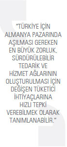 ve önemi her geçen gün artan makine ile hizmet sektörünü de içeriyor. Türkiye için Almanya pazarında aşılması gereken en büyük zorluk sürdürülebilir tedarik ve hizmet ağlarının oluşturulması için değişen tüketici ihtiyaçlarına hızlı tepki verebilmek olarak tanımlanabilir.