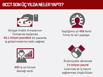 Ülke ticaret odaları karşılıklı olarak ülkelerin ticari ve sosyal dinamiklerine hâkim biçimde bir nevi ticari ve kültürel köprü görevi üstleniyor. Bu alanda BCCT de, Türkiye ile Birleşik Krallık arasında tam 130 yıldır kurulan bağı giderek güçlendiriyor. BCCT, Birleşik Krallık dışında faaliyet gösteren ikinci en eski ticaret odasıdır. İki ülke arasında ticari ilişkileri geliştirmek ve yeni iş birlikleri yaratmak hedefiyle projeler geliştiriyoruz. BCCT, son üç yılda 68,1 milyon poundluk bir pazarda yardımcı rol oynadı. BCCT İş Geliştirme Ekibi ise 2016 yılında firmalara ayda ortalama 57,1 servis verdi ve yıl boyunca 488 firma ile iletişime geçerek, 685 iş ve hizmet desteği sağladı. BCCT, özelleştirilmiş hizmetleriyle Birleşik Krallık- Türkiye ticaret ilişkilerine yoğun katkıda bulunurken, bu katkı ile Birleşik Krallık şirketleri kısa ve uzun vadede iş hacimlerinde ciddi değer artışları görüyor. İş dünyasındaki bu ilişkilerini geçtiğimiz yıl Türkiye’de yatırıma dönüştüren şirketler ise yenilenebilir enerji, sağlık, makine mühendisliği, kimyasallar, liman ve lojistik alanlarında faaliyet gösteriyor. Özetle BCCT, Türkiye ve Birleşik Krallık arasındaki ticari ilişkilerin geliştirilmesinde kilit rol oynuyor ve verimli işbirliklerine arabuluculuk yapıyor. BCCT bünyesinde yer alan İş Geliştirme Bölümü de her iki ülkede karşılıklı işbirliği, yatırım ve ortaklık yapmak isteyen şirketlerin iş geliştirme potansiyeline ivme kazandırıyor.