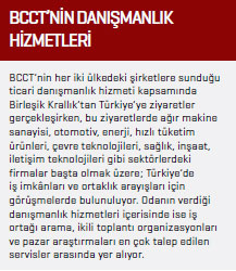 BCCT, Türk firmalarıyla iş yapmak isteyen Birleşik Krallık firmalarını Türkiye ekonomisi ve şirketleri hakkında bilgilendirirken, üyeleri adına Birleşik Krallık’taki ticaret ve sanayi odaları ve ticaret bakanlığı ile ilişkileri geliştiriyor. BCCT’nin her iki ülkedeki şirketlere sunduğu ticari danışmanlık hizmeti kapsamında Birleşik Krallık’tan Türkiye’ye ziyaretler gerçekleşirken, bu ziyaretlerde ağır makine sanayisi, otomotiv, enerji, hızlı tüketim ürünleri, çevre teknolojileri, sağlık, inşaat, iletişim teknolojileri gibi sektörlerdeki firmalar başta olmak üzere; Türkiye’de iş imkânları ve ortaklık arayışları için görüşmelerde bulunuluyor. Odanın verdiği danışmanlık hizmetleri içerisinde ise iş ortağı arama, ikili toplantı organizasyonları ve pazar araştırmaları en çok talep edilen servisler arasında yer alıyor.