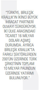 Birleşik Krallık ile Türkiye arasındaki dinamiklerinin diğer AB üyesi ülkelere oranla daha aktif bir durumda olduğunu söyleyebiliriz. Son yıllarda Türk yatırımcıların İngiltere pazarındaki varlığını güçlendirmeleri de geleceğe yönelik umudumuzu artırıyor. Bu arada İngiliz yatırımcılar da Türkiye’nin dinamik pazarını gözden uzak tutmuyor. Bu anlamda, Brexit sonrası Türkiye-Birleşik Krallık ilişkilerinin, Türkiye’nin AB ile olan ilişkilerinden daha hızlı bir ivme kazanabileceğini öngörüyoruz. Dolayısıyla, uzun vadede fayda sağlamak adına vizyonu şimdiden ortaya koyarak hazırlıklarının yapılması, ortak iş konseyi başta olmak üzere ileriye dönük olasılıklar üzerinde fikir üretecek yeni mekanizmaların da şimdiden hayata geçirilmesinde büyük fayda olduğunu söyleyebiliriz. Birleşik Krallık ve Türkiye’deki ticaret ve hizmet sektörleri, birbirlerinin karşılıklı etkileşiminden kaynaklanan olumlu ve yapıcı bir deneyim kazanıyor. Ancak uzmanlar her iki ülkenin de ekonomilerinin artık bütünleyici bir anlayışla daha çok üretime dönük projeleri düşünmeye başlamalarının da zamanı geldiğini belirtirken, bu konuda iki ülkenin ekonomik yapılarının birbirlerini bütünleyici özelliklerine yoğunlaşan projeler de ivme kazanıyor.