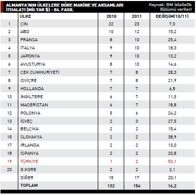 2011 yılında Almanya’nın makine ithal ettiği başlıca ülkeler arasında değer bazında artışa göre yapılan sıralamada Türkiye yüzde 53,1 artış ile ilk sırada yer aldı.