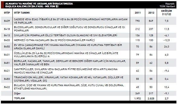 Türkiye’nin Almanya’ya gerçekleştirdiği makine ihracatında yüzde 2,7 artış gerçekleşti. Türkiye’nin 2012 yılında Almanya’ya ihraç ettiği makine ve aksamlarında ilk sırada motorların aksam ve parçaları yer aldı. 849 milyon dolarlık ihracat gerçekleştirilen bu kalemin ardından ikinci sırada buzdolapları, dondurucular ve diğer soğutucu ve dondurucu cihazlar ve ısı pompaları bulunuyor. 2011 yılında 212 milyon dolarlık ürün ihraç edilen Almanya’ya, söz konusu kalemde 2012 yılı ihracatı 237 milyon dolara yükseldi.