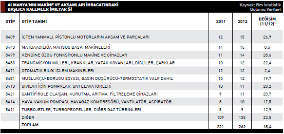 Türkiye Almanya’nın ihracat gerçekleştirdiği ülkeler sıralamasında 16’ncı olurken, 2011 yılında ithal ettiği makine aksamlarının değeri 5 milyar dolar oldu. Almanya’nın 84. fasılda en fazla ihracat gerçekleştirdiği ilk üç ürün grubu sırasıyla; içten yanmalı, pistonlu motorların aksam ve parçaları, matbaacılığa mahsus baskı makineleri ve kendine özgü fonksiyonlu makine ve cihazlar oldu.2010 yılına göre en fazla ihracat artışı yüzde 28,6 ile kendine özgü fonksiyonlu makine ve cihazlar ürün grubunda gerçekleşti. Söz konusu ürün grubunda Almanya’nın ihracatı 14 milyon dolara yükseldi.