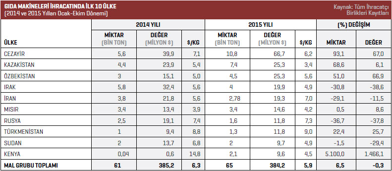 Gıda sanayi makineleri kaleminde 2015 yılının Ocak-Ekim döneminde en fazla ihracat gerçekleştirilen ülke 66,7 milyon dolarla Cezayir oldu. Yüzde 67 ihracat artışının yaşandığı Cezayir’e 2014 yılının aynı döneminde 39,9 milyon dolarlık ihracat gerçekleştirilmişti. İkinci sırada bulunan Kazakistan’a yönelik gıda sanayi makineleri ihracatı 2015 yılının Ocak-Ekim döneminde 25,3 milyon dolar oldu. Yüzde 6,1 ihracat artışının yaşandığı söz konusu ülkeye 2014 yılının aynı döneminde gönderilen ürünlerin değeri 23,9 milyon dolardı. Listenin üçüncü sırasında yer alan Özbekistan’a 2014 yılının Ocak-Ekim döneminde 15,1 milyon dolarlık ürün ihraç edilirken bu rakam 2015 yılının aynı döneminde yüzde 66,9 artarak 25,3 milyon dolar seviyesine yükseldi. Dördüncü sırada bulunan Irak’a 2015 yılının Ocak-Ekim döneminde 19,9 milyon dolar değerinde ihracat gerçekleştirildi. Beşinci sıradaki İran’a 2015 yılının Ocak-Ekim döneminde 19,3 milyon dolar değerinde gıda sanayi makineleri ihracatı gerçekleştirildi.