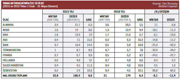 Vanalar ihracatı 2016 yılının Ocak-Mayıs döneminde 174 milyon dolar olarak kayda geçti.