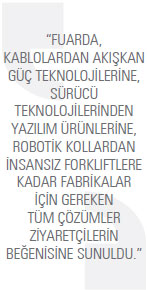 Automation Eurasia’da ziyaretçiler, hayvan ve insan hareketlerini taklit ederek tasarlanan ve daha kompakt bileşenlerle donatılan entegre ve robot endüstriyel çözümlerini görme fırsatına sahip oldu. Teknolojik ilerlemenin yüksek düzeyine işaret eden ve doğal ölçülere sahip insansı robot tasarımı “RoboThespian” ziyaretçilerden yoğun ilgi gördü. Materials Handling Eurasia Fuarı’nda da ziyaretçilere yenilikçi ve enerji tasarruflu yük kaldırma araçları ve endüstriyel araçlar, tam otomatik elleçleme, raf ve depolama sistemleri sergilendi. Uygulama parkı alanında, paletsiz ulaşıma olanak sağlayan forkliftler, ziyaretçilere canlı çözüm gösterisi sundu. Electrotech Eurasia Fuarı kapsamında da IP numarasına sahip ve birbiriyle haberleşebilen elektronik komponentler, akıllı ve inceltilmiş emniyet röleleri gibi çeşitli ürünler sergilendi. Ayrıca Hydraulic & Pneumatic Eurasia Fuarı’nda, otomasyon teknolojilerini geliştirmeyi destekleyen ve enerji tasarruflu sızdırmazlık formülüne sahip ürünler gibi akışkan güç sistemlerindeki yenilikler de beğeni topladı. Fuarlarda sunulan ürünler ve çözümlere ek olarak, sektör içinde ve dışında bilgi alışverişine olanak sağlayan forumlarla panellerde de, üretim sektöründe geleceğin teknolojileri ön plandaydı.