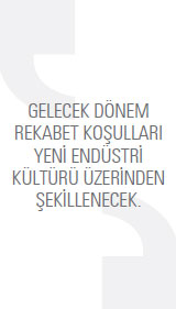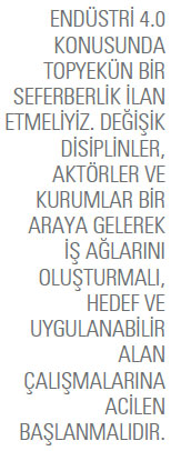 knolojileri bahsinde güvenlik ve hukuk mevzuatının yeniden düzenlenmesine neden olacak kamusal bir ilişki de söz konusudur. Ayrıca “İnsan-İş” ilişkisinin yeniden dizayn ve formüle edileceği düzlemden bahsedebiliriz. Tüm bunlar akşamdan sabaha olacak şeyler değil muhakkak ama internet teknolojilerindeki hız göz önünde bulundurulduğunda yakın gelecekte bu yeni durumun belirleyici olacağını söyleyebiliriz. Endüstri 4.0 konusunda topyekun bir seferberlik gerekli. Değişik disiplinler, aktörler ve kurumlar bir araya gelerek iş ağlarını oluşturmalı, hedef ve uygulanabilir alan çalışmalarına acilen başlanmalıdır. Bu alanda çalışma yürüten ülkeler arasında konunun liderliği için mücadele başlamış durumda, herkes gardını alırken bu yeni dönem için partnerlerini de belirlemeye çalışıyor.