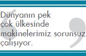 Ülkemizin makine üreticiliği alanında son yıllarda gösterdiği gelişme oldukça sevindirici. Türk firmaları artık dünyanın çeşitli ülkelerinde faaliyet gösteren global markalarla yarış halinde. Durum böyle olunca malzeme, teknoloji ve ham madde kullanımında oldukça nitelikli tercihlerde bulunmanız gerekiyor. Bu standartları gözeten firmaların ve bir bütün olarak ülkemiz makine sektörünün önümüzdeki yıllarda daha da başarılı olacağına inanıyorum. Tabi ki yerli üreticinin korunmasına yönelik çeşitli önlemlerin alınması ve hiçbir standart gözetilmeden üretilen ithal ürünlerin piyasada yarattığı haksız rekabetin ortadan kaldırılması da devletimizden en büyük beklentilerimiz arasında.