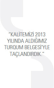 “Müşterilerimiz için değer yaratmayı, onların beklentilerine kalite ve istikrarla karşılık vermeyi amaç edinen firmamız, başarısını Turqum Belgesi’yle taçlandırmak için 2012 yılından itibaren bu yönde çalışmaya başladı” diyen Aydoğan, sözlerini şöyle sürdürdü: “Üretimimizi, 2013 yılının Kasım ayından bu yana da Turqum Belgeli bir firma olarak sürdürüyoruz. Ürünlerinin büyük bir bölümünü yurt dışına ihraç eden bir firma olarak, Turqum Belgesi güvencesiyle Türk makinelerinin kalitesini dünyaya göstermek için çalışıyoruz.”