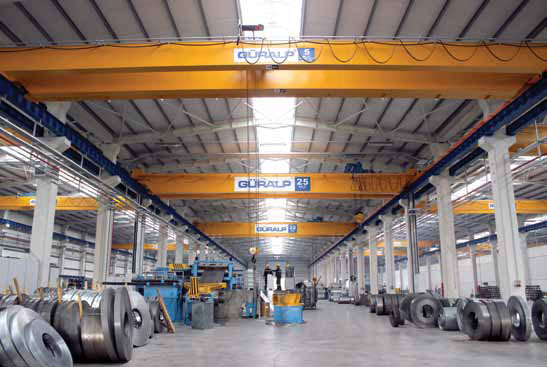 Güralp Vinç’in ürün yelpazesi standart üretimlerimiz için halatlı kaldırma makinelerinde 80 ton, zincirli kaldırma makinelerinde ise 2 tondur. Kaldırma makineleri olarak belirttiğim bu standart gamda 152 farklı tip ürünümüz bulunuyor. Köprü konstrüksiyonları ve diğer taşıyıcı konstrüksiyon yapılarda ise tamamen talebe bağlı projelerle üretim yapıyoruz. Bunların yanı sıra özel ataçmanlar, transfer arabaları, katalog dışında kalan özelliklerde ve daha yüksek kapasitelerde özel proje kapsamında, kaldırma makineleri üretimiz de mevcut. Ayrıca ülkemizde otomasyona dayalı proses vinç uygulamalarını yapabilen ilk firmayız. Ürünlerimiz mekaniksel ve elektriksel vinç sistemleri ile ilgili FEM standartlarına uyumlu olarak üretiliyor ve en güncel teknolojik donanım ve yazılım sistemlerine sahip. Kalite standartlarından asla ödün vermeden ürünlerimizi oluşturan tüm malzeme ve parçalar tüm imalat sürecince sıkı kontrollerden geçiriliyor ve tamamlanan her vinç kendi kapasite ve donanımında statik ve dinamik testlere tabi tutuluyor. Her vinçte standart olarak bulunan elektronik aşırı yük hücresi test sahasında gerçek yük değerleri ile ayarlanıyor.