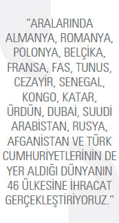 Aralarında Almanya, Romanya, Polonya, Belçika, Fransa, Fas, Tunus, Cezayir, Senegal, Kongo, Katar, Ürdün, Dubai, Suudi Arabistan, Rusya, Afganistan ve Türk Cumhuriyetlerinin de yer aldığı dünyanın 46 ülkesine ihracat gerçekleştiriyoruz. Bunların birçoğu sürekli ürün gönderilen ülkeler. Bu yıl biraz daha uzak pazarları hedefledik. Yurt dışı satışlarımızda birçok ülkede partnerlerimiz, bayilerimiz var. Satış ve satış sonrası hizmet faaliyetlerimizi bu şekilde destekleyerek etkinliğimizi artırmaya çalışıyoruz. Aktif olduğumuz pazarlarda marka bilinirliğimiz hissedilir şekilde yükseldi. İmalat gerçekleştirdiğimiz her kalemde ihracatımız mevcut Genel olarak kaldırma makineleri, köprü yürüyüş takımları ve elektrik sistemleri ihracatımızda ön plandadır. Ancak komple sistem çözümü ve projelendirme gibi mühendislik kabiliyetlerimizi de yurt dışı pazarlarda kullanabiliyoruz.