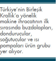 Türkiye’nin 84. fasılda Birleşik Krallık’a gerçekleştirdiği makine ihracatı, 2012 yılında 871,1 milyon dolar olarak kaydedildi. 2011 yılında bu rakam 869,8 milyon dolardı. Birleşik Krallık’a yönelik makine ihracatındaki artış yüzde 0,1 oldu. Türkiye’nin Birleşik Krallık’a yönelik makine ihracatının ilk sırasında buzdolapları, dondurucular, soğutucular, ısı pompaları ürün grubu yer alıyor. Söz konusu kalemde Birleşik Krallık’a 2011 yılında 270 milyon dolar değerinde makine ihraç edilirken bu rakam, 2012 yılında yüzde 8,5 artışla 292 milyon dolar seviyesine yükseldi. Listenin ikinci sırasında bulunan çamaşır yıkama makineleri kaleminde 2012 yılında Birleşik Krallık’a ihraç edilen ürünlerin değeri, bir önceki yıla göre yüzde 6,5 artışla 143,6 milyon dolar olarak kaydedildi. 2011 yılında bu rakam 134,9 milyon dolar seviyesindeydi. Türkiye’nin Birleşik Krallık’a yönelik makine ihracatında ilk 10 ürün grubu listesinin üçüncü sırasında yıkama, temizleme, kurutma, doldurma vb. işler için makine ve cihazlar yer alıyor. Söz konusu kalemde Birleşik Krallık’a 2011 yılında 69,4 milyon dolarlık ihracat gerçekleştirilirken bu rakam 2012 yılında 17,5 artışla 81,6 milyon dolar seviyesine yükseldi. 2012 yılında Türkiye’nin Birleşik Krallık’a yönelik makine ihracatında en fazla artış yüzde 82,3 ile muslukçu, borucu esyası-basınç düşürücü, termostatik valf dahil kaleminde gerçekleşti. Söz konusu ürün grubunda 2011 yılında 4,8 milyon dolarlık ihracat gerçekleştirilirken bu rakam, 2012 yılında 8,7 milyon dolara yükseldi.