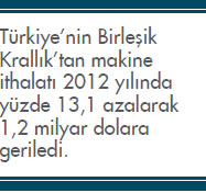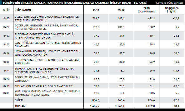 2012 yılında 84. fasıl itibariyle Türkiye’nin Birleşik Krallık’tan makine ithalatının ilk sırasında dizel, yarı dizel motorlar (hava basıncı ile ateşlenen, pistonlu) kalemi bulunuyor. Söz konusu ürün grubunda 2011 yılında 724 milyon dolarlık ithalat gerçekleştirilirken bu rakam 2012 yılında, yüzde 16,1 azalarak 607,2 milyon dolar olarak kaydedildi. İthalat listesinin ikinci sırasında yer alan dozerler, greyder, skreyper, ekskavatör, küreyici, yükleyici vb. ürün grubunda 2012 yılında 131,1 milyon dolarlık ithalat gerçekleştirildi. 2011 yılında söz konusu kalemdeki ithalatın değeri 119,2 milyon dolar seviyesinde. Dozerler, greyder, skreyper, ekskavatör, küreyici, yükleyici vb. kaleminde 2012 yılında yaşanan ithalat artışı bir önceki yıla oranla yüzde 9,9 olarak kaydedildi. Türkiye’nin Birleşik Krallık’tan makine ithalatında ilk 10 ürün grubu listesinin üçüncü sırasında alternatif rotatif kıvılcım ateşlemeli, içten yanmalı motorlar yer alıyor. 2011 yılında söz konusu kalemde 79,2 milyon dolarlık ithalat gerçekleştirilirken bu rakam 2012 yılında yüzde 21,8 azalarak 61,9 milyon dolar oldu. 2012 yılında Türkiye’nin Birleşik Krallık’tan makine ithalatında en fazla artış yüzde 31,5 ile forkliftler; kaldırma, istifleme tertibatlı saryolar kaleminde gerçekleşti. 2011 yılında forkliftler; kaldırma, istifleme tertibatlı saryolar kaleminde 15,2 milyon dolar değerinde ithalat gerçekleştirilirken bu rakam 2012 yılında 20 milyon dolar olarak kayda geçti. Türkiye’nin 2011 yılında Birleşik Krallık’tan gerçekleştirdiği makine ithalatı 1,4 milyar dolarken bu rakam 2012 yılında yüzde 13,1 azalarak 1,2 milyar dolar seviyesinde kaydedildi.