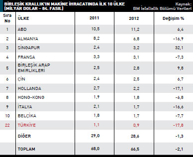 Birleşik Krallık’ın makine ihracatı 2012 yılında bir önceki yıla göre yüzde 2,1 azalarak 66,5 milyar dolar olarak kaydedildi. 2011 yılında bu rakam 68 milyar dolar seviyesindeydi. Birleşik Krallık en fazla makine ihraç eden ülkeler listesinin sekizinci sırasında yer alıyor. Birleşik Krallık 2012 yılında en fazla ABD’ye makine ihracatı gerçekleştirdi. 2011 yılında ABD’ye 10,5 milyar dolar değerinde makine ihraç ederken bu rakam, 2012 yılında yüzde 6,4 artarak 11,2 milyar dolar seviyesine yükseldi. 2012 yılında Birleşik Krallık’ın en fazla makine ihraç ettiği ikinci ülke Almanya oldu. Söz konusu ülkeye 2012 yılında ihraç edilen makinelerin değeri 6,8 milyar dolar olarak kaydedildi. 2011 yılında Birleşik Krallık’ın Almanya’ya ihraç ettiği makinelerin değeri 8,2 milyar dolar seviyesindeydi. 2012 yılında Almanya’ya yönelik makine ihracatında yüzde 16,9 oranında azalma gerçekleşti. Birleşik Krallık’ın en fazla makine ihraç ettiği ilk 20 ülke listesinin üçüncü sırasında ise Singapur yer alıyor. 2011 yılında Singapur’a 2,4 milyar dolarlık makine ihraç edilirken bu rakam, 2012 yılında yüzde 32,1 artarak 3,2 milyar dolara yükseldi. Birleşik Krallık’ın 2011 yılına göre makine ihracatını en fazla artırdığı ülke yüzde 32,1 ile Singapur oldu. Birleşik Krallık’ın Türkiye’ye yönelik makine ihracatı 2011 yılında 1,1 milyar dolarken bu rakam 2012 yılında, yüzde 17,8 azalarak 900 milyon dolar seviyesine geriledi. Türkiye, Birleşik Krallık’ın en fazla makine ihraç ettiği ülkeler listesinin 22. sırasında bulunuyor. Birleşik Krallık 84. fasılda en fazla turbojetler, turbo-propeller, diğer gaz türbinleri kaleminde ihracat gerçekleştirdi. 2011 yılında söz konusu ürün grubunda 18,9 milyar dolar değerinde ihracat gerçekleştirilirken bu rakam, 2012 yılında 6,3 artarak 20,1 milyar dolar seviyesine yükseldi. Listenin ikinci sırasında ise dizel, yarı dizel motorlar (hava basıncı ıle ateşlenen, pistonlu) ürün grubu bulunuyor. Söz konusu kalemde 2012 yılında gerçekleştirilen ihracatın değeri 4,1 milyar dolar oldu. 2011 yılında bu rakam 5,1 milyar dolar seviyesindeydi. Dizel, yarı dizel motorlar (hava basıncı ıle ateşlenen, pistonlu) mal grubuna dahil makinelerin ihracatında yüzde 19,1 azalma gerçekleşti. Listenin üçüncü sırasında yer alan tarifenin başka bir yerinde otomatik bilgi işlem makineleri, üniteleri kaleminde 2012 yılında gerçekleştirilen ihracatın değeri 3,9 milyar dolar olarak kaydedildi. Birleşik Krallık’ın 2012 yılında, bir önceki yıla göre 19,3 ile ihracatını en fazla artırdığı ürün grubu muslukçu, borucu eşyası-basınç düşürücü, termostatik valf dahil oldu. Söz konusu ürün grubunda 2011 yılında 3,1 milyar dolarlık ihracat gerçekleştirilirken, 2012 yılında bu rakam 3,7 milyar dolar değerine yükseldi.