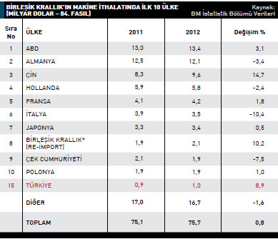 Birleşik Krallık’ın makine ithalatı 2012 yılında bir önceki yıla göre yüzde 0,8 artarak 75,7 milyar dolar oldu. 2011 yılında bu rakam 75,1 milyar dolar seviyesindeydi. 2012 yılı verilerine göre Birleşik Krallık’ın 2012 yılında en fazla makine ithal ettiği ilk 20 ülke listesinin ilk sırasında ABD yer alıyor. 2011 yılında ABD’den 13 milyar dolarlık ithalat gerçekleştirilirken bu rakam, 2012 yılında yüzde 3,1 artışla 13,4 milyar dolar değerine ulaştı. Birleşik Krallık 2012 yılında listenin ikinci sırasında bulunan Almanya’dan 12,1 milyar dolarlık makine ithal etti. 2011 yılında bu rakam 12,5 milyar dolardı. Birleşik Krallık’ın Almanya’dan gerçekleştirdiği makine ithalatı 2012 yılında yüzde 3,4 oranında azaldı. Birleşik Krallık’ın en fazla makine ithal ettiği ilk 20 ülke listesinin üçüncü sırasında ise Çin bulunuyor. 2011 yılında Çin’den 8,3 milyar dolar değerinde makine ithal eden Birleşik Krallık, 2012 yılında yüzde 14,7 artışla makine ithalatını 9,6 milyar dolar seviyesine yükseltti. Birleşik Krallık’ın 2012 yılında bir önceki yıla oranla makine ithalatını en fazla artırdığı ülke yüzde 14,7 ile Çin oldu. Türkiye, Birleşik Krallık’ın makine ithal ettiği ülkeler listesinin 15. sırasında bulunuyor. 2011 yılında Türkiye Birleşik Krallık’a 900 milyon dolar değerinde makine ihraç ederken bu rakam 2012 yılında, yüzde 0,8 artışla 1 milyar dolar seviyesine yükseldi. Birleşik Krallık 2012 yılında en fazla turbojetler, turbo-propeller, diğer gaz türbinleri kaleminde makine ithal etti. 2011 yılında söz konusu ürün grubunda 13,2 milyar dolarlık ithalat gerçekleştirirken bu rakam, 2012 yılında yüzde 13,6 artışla 15 milyar dolar seviyesine yükseldi. Listenin ikinci sırasında otomatik bilgi işlem makineleri, üniteleri bulunuyor. Birleşik Krallık 2012 yılında söz konusu kalemde 14,3 milyar dolarlık ithalat gerçekleştirdi. 2011 yılında bu rakam 13,2 milyar dolardı. Birleşik Krallık’ın otomatik bilgi işlem makineleri, üniteleri kaleminde gerçekleştirdiği ithalattaki artış yüzde 8 olarak kaydedildi. En fazla ithalat gerçekleştirilen üçüncü kalem ise içten yanmalı, pistonlu motorların aksam-parçaları oldu. 2011 yılında söz konusu ürün grubunda 3,9 milyar dolarlık ithalat gerçekleştirilirken bu rakam 2012 yılında, yüzde 6,3 azalarak 3,7 milyar dolar olarak kaydedildi. Birleşik Krallık’ın makine ithalatında en fazla artış yüzde 13,6 ile turbojetler, turbo-propeller, diğer gaz türbinleri kaleminde gerçekleşti.