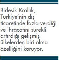 Geleneksel olarak ülkemizin çok önemli bir ticaret ortağı ve dünyanın altıncı büyük ekonomisi olan Birleşik Krallık, Türkiye’nin dış ticaretinde fazla verdiği ve ihracatını sürekli artırdığı gelişmiş ülkelerden biri olma özelliğini koruyor. Türkiye 2001 yılından beri Birleşik Krallık’a yönelik dış ticaretinde fazla veriyor. 2002 yılında 3 milyar dolar olan ihracatımız 2012 yılında 8 milyar dolar düzeyinde gerçekleşti. 2012 yılı itibarıyla Türkiye ile Birleşik Krallık arasındaki ticaret hacmi 14,3 milyar dolar değerine yükselirken, bu ülke ile yapılan ticarette verilen fazla, 3 milyar dolar oldu. 2012 yılında Türkiye’nin Birleşik Krallık’a yaptığı ihracat genel madde grupları itibariyle incelendiğinde, önceki yıllara göre ihracata konu madde gruplarında önemli bir değişiklik olmadığı görülüyor. Birleşik Krallık’a ihracatta genel olarak tekstil ve hazır giyim ürünleri, elektrikli ve elektriksiz makineler, motorlu araçlar ve parçaları, demir çelik ürünleri önemli kalemleri oluşturuyor. AB üyesi olan Birleşik Krallık tarafından, AB üyesi olmayan ülkelere karşı, topluluğun ortak gümrük tarifesi uygulanıyor. Türkiye-AB Gümrük Birliği Anlaşması çerçevesinde, Türkiye’ye karşı sanayi ürünlerinde gümrük vergisi uygulanmıyor. İşlenmiş tarım ürünlerinde tarım payı (miktar üzerinden uygulanan ve ortak tarım politikasından kaynaklanan bir koruma aracıdır) üzerinden ve gümrük birliği kapsamında bulunmayan işlenmemiş tarım ürünleri için ise ortak tarım politikası çerçevesinde tespit edilen spesifik vergiler alınıyor.