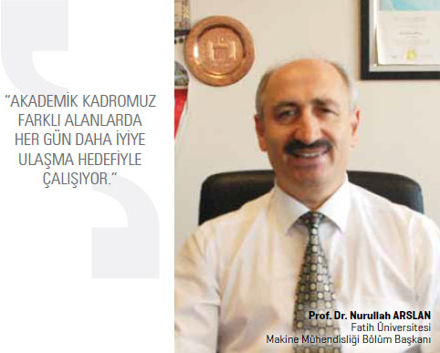 Fatih Üniversitesi Makine Mühendisliği Bölümü 2012 yılında eğitim-öğretime başladı. İlk mezunlarını 2016 yılında vermeye hazırlanan bölüm, öğrencilerine sunduğu teknik ve altyapı olanaklarıyla dikkat çekiyor. TÜBİTAK ve SANTEZ projeleri kapsamında sanayiye katkı sağlayacak bilimsel çalışmaları sürdürdüklerini söyleyen Fatih Üniversitesi Makine Mühendisliği Bölüm Başkanı Prof. Dr. Nurullah Arslan, “Gelişen teknolojiye uygun bir eğitim sistemi benimsiyor, endüstrinin beklentilerine cevap verecek mühendisler yetiştiriyoruz” dedi. Prof. Dr. Nurullah Arslan bölümün yapısı, öğrencilerine sağladıkları imkanlar ve geleceğe yönelik hedefleriyle ilgili bilgi verdi.