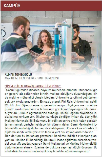 yılında açılan Makine Mühendisliği Bölümü öğrencilerine teorik eğitimin yanında endüstride çalışma imkanı da sunuyor. Bunun için hayata geçirdikleri projeleri de var. “Endüstri ile Ortak Eğitim Programı” olarak adlandırdıkları bir program uyguluyorlar. Bu program sayesinde öğrenciler henüz lisans eğitimi alırken, bir taraftan da sektörün önemli şirketlerinde deneyim kazanabiliyorlar. Mezuniyet sonrası da isterlerse Tuzla Gemi İnşa Bölgesi’nde istihdam ediliyorlar. Piri Reis Üniversitesi henüz yeni kurulmasına rağmen oldukça iddialı. Üniversite proje tabanlı öğretimi önemsiyor. Öğrenciler bu eğitim vizyonu sayesinde sadece okuyarak ya da dinleyerek değil, malzemeleri eline alarak, üretim yapmayı öğreniyorlar. Üniversitenin eğitim dinamiklerini ve uzun vadeli hedeflerini Makine Mühendisliği Bölüm Başkanı Mehmet Sander Çalışal ile konuştuk.