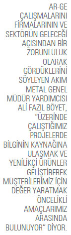 Akım Metal Ar-Ge Merkezi’nde toplam 67 kişilik bir ekiple servo motor, ledli aydınlatma, led ve motor sürücüleri ile takım tezgahlarıyla ilgili çalışmalar yürüttüklerini ifade eden Böyet, firma bütçesinin önemli bir kısmını Ar-Ge çalışmaları için ayırdıklarının altını çiziyor.