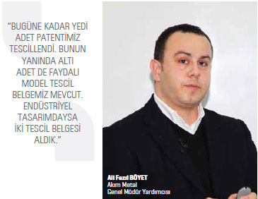 Ar-Ge Merkezi kurulduktan sonra daha önce çalışmadığımız; İstanbul Teknik, Gebze Teknik, Yıldız Teknik, Ortadoğu Teknik, Kocaeli, Özyeğin, Sabancı, İstanbul ve Okan üniversiteleriyle ortak proje çalışmalarına da başladık. Bunların dışında birçok üniversite ile ortak proje için görüşmelerimiz de devam ediyor ve San- Tez ile TEYDEB projelerimizi hızla sürdürüyoruz. Bu çalışmaların yanı sıra muhtelif Ar-Ge projeleri dolayısıyla firmamızı ziyaret eden öğretim üyelerinin görüş ve önerileri de her zaman dikkate alıyoruz. Tasarım ortaklarımızla kısa ve uzun vadeli işbirliği ile ortaklıklar da gerçekleştiriyoruz. Ayrıca bazı öğretim üyesi hocalarımızla da proje bazlı olarak çalışmalar yapıp danışmanlık hizmeti de alıyoruz. Akım Metal tarafından pek çok konuda mühendislik desteği gören İstanbul Üniversitesi Hidrojen Yakıtlı Araç Ekibi Hidroist, firmamızı ziyaret ederek aracını da sergiledi. Bahsettiğim bu projeler sayesinde CNC tezgah, sanayi motorları, led aydınlatma, medikal ile küçük ev aletlerinde ilk ürünlerimiz ve markalarımız da oluşmaya başladı. Bunların dışında iki yılda 14 patent ve marka tesciliyle ürünlerimizi koruma altına aldık. Özellikle Ar-Ge projelerimizin tanıtımı için yurt içi ve yurt dışı fuar çalışmalarına başlayarak ileriye dönük stratejiler benimsedik.