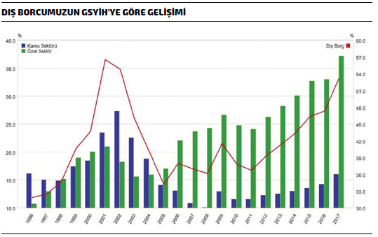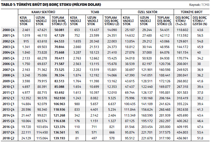 Küresel kriz sonrasında dünya piyasaları ve borsaları uzun vadeli yükseliş eğilimindeydi. Para bol ve ucuzdu. Faizler tarihin en düşük düzeyine gerilemişti. Böyle bir ortamda, geçen 10 yılda gelişmiş dünya borsaları yüzde 229, gelişmekte olan borsalar da yüzde 187 prim yaptı. Dünyada “bol ve ucuz para” döneminde Çin, Türkiye, Brezilya ve Güney Kore en hızlı F/X borçlanan ekonomiler olurken, finans sektörleri için kaynak bulmak hem ucuzladı hem de kolaylaştı. Bu kolaylık sayesinde gelen kaynaklar, borsa ve bono tahvil piyasalarını iyileştirirken Türkiye’nin büyümesini finanse edecek kredileri bulmayı da kolaylaştırdı. Türkiye’nin bu kadar kolay dış kredi bulabildiği ortamda, toplam dış borç stoku Merkez Bankası’nın verilerine göre 2002 yılı sonundaki 118 milyar dolardan, 2010 yılında 267 milyar dolara ve 2018 yılında 456 milyar dolara yükseldi. Tablo 1’den de izlenebileceği gibi, bu artışla birlikte dikkat çekici önemli detay ise 2010 yılında 85 milyar dolar olan kamu borcunun 2018 yılında 139 milyar dolara çıkması; 2010 yılında 169 milyar dolar olan özel sektör borcunun ise 2018 yılında 317 milyar dolara yükselmesiydi. Rakamlar, kamu borçlanmasına oranla esas borçlanmanın özel sektör tarafından gerçekleştirildiğini açıkça ortaya koyarken, Grafik 1’de, Türkiye’nin dış borcunun GSYİH’ye göre gelişimi de görülebilir. Özetle, Türkiye’nin son sekiz yıldaki büyümesinin ana finansmanı, kamu ve özel sektör borçlanması ile karşılanırken, Türkiye’nin borçlu olduğu bu 456 milyar doların alacaklısının da büyük ağırlıkla ABD’li ve Avrupalı bankalar ve kurumlar olduğunu belirtmeliyiz.