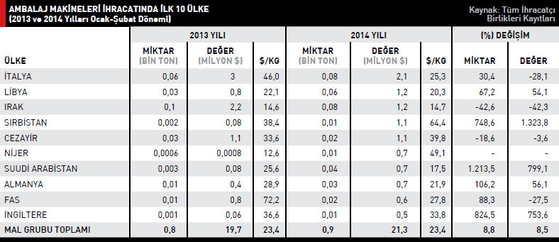 Ambalaj makineleri ürün grubunda 2013 yılının Ocak-Şubat döneminde 19,7 milyon dolarlık ihracat gerçekleştirilirken bu rakam, 2014 yılının aynı döneminde yüzde 8,5 artışla 21,3 milyon dolara yükseldi. Ambalaj makineleri mal grubunda 2014 yılının Ocak-Şubat döneminde 2 milyon dolarla en fazla İtalya’ya ihracat gerçekleştirildi. Listenin ikinci sırasında ise Libya bulunuyor. 2013 yılının Ocak-Şubat döneminde Libya’ya ihraç edilen ürünlerin değeri 841 bin dolarken bu rakam, 2014 yılı - nın aynı döneminde yüzde 54,1 artışla 1,2 milyon dolar olarak kayda geçti. Üçüncü sıradaki Irak’a 2014 yılının Ocak-Şubat döneminde 1,2 milyon dolar değerinde ambalaj makinesi ihraç edildi. Listenin dördüncü ve beşinci sırasında ise Sırbistan ve Cezayir yer alıyor. Dördüncü sıradaki Sırbistan’a 2013 yılının Ocak-Şubat döneminde gönderilen ürünlerin değeri 82 bin dolarken bu rakam 2014 yılının aynı döneminde, yüzde 1.323 artışla 1,1 milyon dolar seviyesine yükseldi. Beşinci sıradaki Cezayir’e ise 2014 yılının Ocak-Şubat döneminde 1,1 milyon dolarlık ihracat gerçek - leştirildi. Ambalaj makineleri ürün grubunda en fazla ihracat artışı yüzde 1.323 ile Sırbistan’da yaşandı. Sırbistan’ın ardından yüzde 799 ile Suudi Arabis - tan gelirken yüzde 753,6 ile İngiltere üçüncü sırada yer aldı.