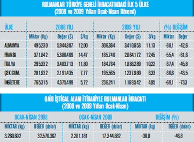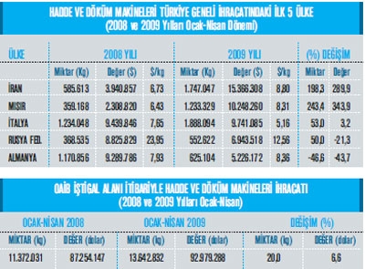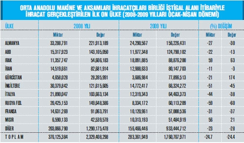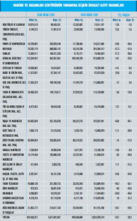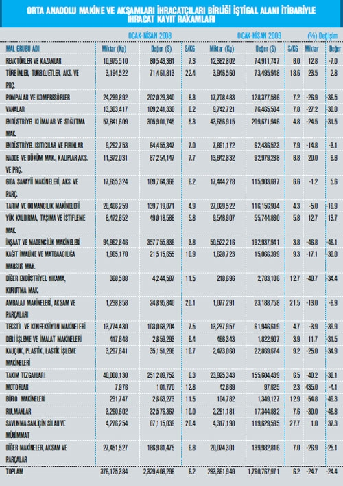 Orta Anadolu Makine ve Aksamları İhracatçıları Birliği iştigal alanına giren GTİP’ler kapsamı nda belirlenen Türkiye geneli ihracat kayıtlarına göre; 2008 yılı Ocak-Nisan dönemi ihracat kayıt rakamı 2 milyar 329 milyon dolar iken, bu rakam 2009 yılının eş zaman diliminde yüzde 24,4 oranında azalarak 1 milyar 760 milyon dolar olarak gerçekleşti. Makine sektörü toplamı, 84. faslın tamamı ve 84. fasıl dışı Orta Anadolu Makine ve Aksamları İhracatçıları Birliği iştigal alanı itibariyle 2009 yılının ilk 4 ayında önceki yılın aynı dönemine kıyasla yüzde 28,3 azalarak 2 milyar 634 milyon dolar olarak kaydedildi. Mal grupları bazında incelendiğinde ise; 2008 yılı Ocak-Nisan döneminde, ihracatı nda en yüksek artış gerçekleşen kalemler ise yüzde 37,3 ile Savunma Sanayi için Silah ve Mühimmat, yüzde 13,7 ile Yük Kaldırma, Taşıma ve İstifleme Makineleri ve yüzde 6,6 ile Hadde ve Döküm Makineleri olmuş. 2009 yılı Ocak-Nisan dönemi ihracatında en fazla gerileme görülen mal grupları ise; ; Büro Makineleri, Rulmanlar, İnşaat ve Madencilik Makineleri olarak sıralanıyor. OAİB iştigal alanına giren ürünler itibariyle, mal gruplarının sektör ihracatından aldıkları paylar incelendiğinde ise; 2009 yılı Ocak-Nisan döneminde; yüzde 11,9 pay ile Endüstriyel Klimalar ve So- ğutma Makineleri birinci, yüzde 11 pay ile İnşaat ve Madencilikte Kullanılan Makineler ikinci ve 8,8 pay ile Takım Tezgâhları üçüncü sırada yer alıyor.