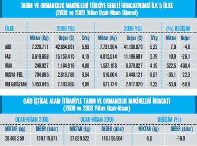 Türkiye tarım ve ormancılık makineleri ihracatı 2009 yılının Ocak-Nisan ayları arasında 116 milyon 156 bin dolar olarak gerçekleşmiş. Tarım ve ormancılık makineleri ihracatımız ülkeler bazında incelendiğ inde ise ABD’nin ilk sırada yer aldığı görülüyor. ABD’ye 2009 yılının ilk 4 aylık döneminde 41 milyon 136 bin dolarlık tarım ve ormancılık makineleri ihracatı yapılmış durumda. ABD’nin ardından en fazla tarım ve ormancılık makineleri ihracatı yaptığımı ülke ise Fas olmuş. Söz konusu ülkeye 2009 yılının Ocak-Nisan ayları arasında 11 milyon 196 bin dolarlık takım tezgâhları ihracatı yapıldığı kaydedilmiş. 2009 Ocak-Nisan dönemi içersinde en fazla tarım ve ormancı lık makineleri ihracatı gerçekleştirdiğ imiz ülke olan Irak aynı zamanda tarım ve ormancı lık makineleri ihracatımızın en hızlı şekilde artış gösterdiği ülke olmuş. Irak’a 2008 yılının ilk 4 aylık döneminde 1 milyon 184 bin dolarlık tarım ve ormancı lık makineleri ihracatımız varken 2009 yılının aynı zaman dilimine gelindiğinde yüzde 438,4 oranında değer artışı ile 6 milyon 379 bin dolar seviyesi yakalanmış. Irak’ın ardından tarım ve ormancılık makinelerinde en fazla ihracat yaptığı- mız dördüncü pazar Rusya Federasyonu olmuş. Rusya Federasyonu’na 2008 yılının Ocak- Nisan döneminde 2 milyon 813 bin dolarlık tarım ve ormancı- lık makineleri ihracatı söz konusu iken 2009 yılının Ocak-Nisan dönemine gelindiğinde ise yüzde 22,3 değer artışı ile 3 milyon 440 bin dolarlık ihracat yapılmış. Tarım ve ormancılık makineleri ihracatımızın en fazla olduğu beşinci ülkenin ise Bulgaristan olduğu görülüyor. Bulgaristan’a 2009 yılının ilk 4 aylık döneminde 2 milyon 917 bin dolarlık tarım ve ormancı- lık makineleri ihracatı yapılmış Fotoğraf Altı: Halit Unlu Ünlü Ziraat Genel Müdür Yüzde 60’lık düşüş yaşadık. Nisan ayı ihracatımızda yüzde 60 oranında bir düşüş var. 129 bin 950 euroluk ihracat gerçekleştirdik bu ay. Çok düşük bir rakam bu. Bütün bu düşüşün sebebi de hepimizin bildiği gibi tüm dünyayı etkisi altına alan küresel kriz. İnsanlar mal almaya korkuyorlar. Yurt dışındaki devlet destekleri kesildi. İnsanlar bu yollarla tarım aletleri alıyorlardı. Çiftçilerin desteklenmesi lazım. Çiftçinin ürettiği ürünün para etmesi lazım ki çiftçi de yatı- rım yapabilsin. Doğrudan desteklemenin önü açılmalı. Sektör olarak yaşadığımız sorunlar ise hammadde, kalite ve fiyatla alakalı sorunlar yaşamaktayı z. Kalifiye eleman bulmakta büyük zorluklar yaşıyoruz. Genel olarak sektör ihracatı nı incelediğimizde ise sektörün Nisan ayı toplam ihracatı nın 116 milyon 159 bin dolar civarında olduğu görülebilir. Bu rakam geçtiğimiz yılın aynı döneminde ise sektör ihracatı 139 milyon 719 bin dolar olarak gerçekleşmişti. Bu da yüzde 16,92luk bir düşüş anlamı- na geliyor.