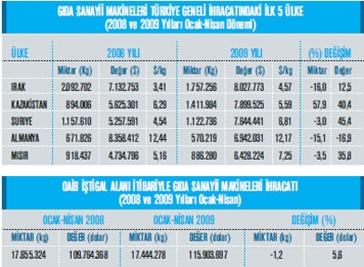 2009 yılı Ocak-Nisan döneminde mal grupları bazında en fazla ihracat yapı- lan ülkeler ise, İnşaat ve Madencilik Makinelerinde; Almanya, Cezayir ve Libya; Endüstriyel Klimalar ve Soğutucularda; İngiltere, Irak ve Fransa, Takım Tezgâhlarında; Irak, Almanya ve İran, Pompa ve Kompresörlerde; Almanya, İtalya ve Romanya, Tarım ve Ormancılık Makinelerinde; ABD, Fas ve Irak, Gıda İşleme Makinelerin- de; Irak, Kazakistan ve Suriye, Vanalarda; Almanya, Irak ve İspanya, Tekstil ve Konfeksiyon Makinelerinde; Hindistan Mısır ve Sudan, Hadde ve Döküm Makinelerinde; İran, Mısır ve İtalya, Reaktör ve Kazanlarda; İstanbul Deri Serbest Bölgesi, İngiltere ve Almanya, Türbin, Turbojet ve Hidrolik Silindirlerde; ABD, Avusturya ve İsviçre, Yük Kaldırma, Taşıma ve İstifleme Makinelerinde; Fas, Rusya Federasyonu ve Cezayir, Kauçuk, Plastik, Lastik İşleme Makinelerinde; Kazakistan, Rusya Federasyonu ve İran, Rulmanlarda; Almanya, Fransa ve İtalya, Ambalaj Makinelerinde ise; İtalya, Güney Afrika Cumhuriyeti ve Irak olmuş. olmuş.