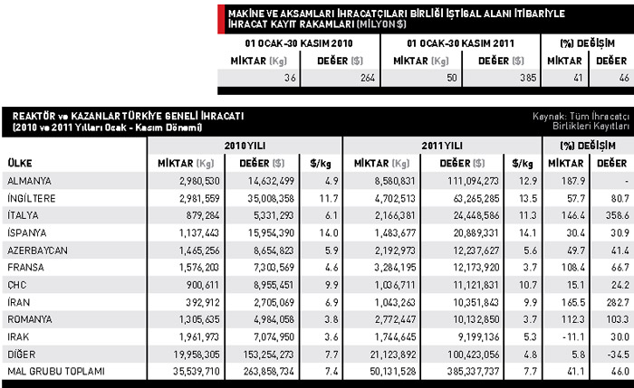 Mal grupları bazında yüzde 46 oranında yükseliş yaşayan reaktör ve kazanlar sektörü ihracatımız, 2011 Kasım ayında ihracat değerini artırdı. 2010 Ocak- Kasım döneminde 264 milyon dolar seviyelerinde seyreden reaktör ve kazanlar sektörü ihracatımız 2011