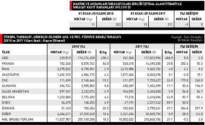 parçaları dikkat çekti. 2010 yılı Ocak-Kasım dönemi arasında 202 milyon dolar değerinde olan türbin, turbojet, hidrolik