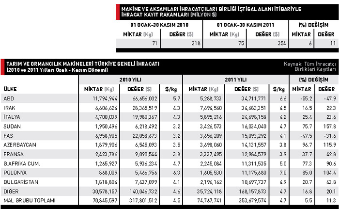 Makine ve Aksamları İhracatçıları Birliği iştigal alanı itibariyle tarım ve ormancılıkta kullanılan makine ve aksamları ihracatı 2010 yılı Ocak-Kasım döneminde 318 milyon dolar seviyelerini yakaladı. Aynı dönemin 2011 yılı ile kıyaslandığında tarım ve ormancılıkta kullanılan makine ve aksamları ihracatımızın yüzde 11 oranında değer kazanarak 354 milyon dolar seviyesine yükseldiği görüldü.