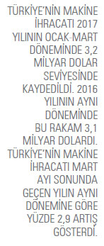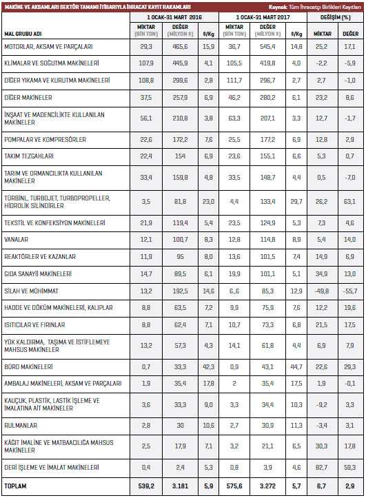 Makine sektöründe 2017 yılının Ocak- Mart döneminde en fazla ihracat gerçekleştiren alt sektör motorlar oldu. 2016 yılının Ocak-Mart döneminde söz konusu ürün grubunda gerçekleştirilen ihracatın değeri 465,6 milyon dolarken 2017 yılının aynı döneminde bu rakam yüzde 17,1 artışla 545,4 milyon dolar seviyesine ulaştı. Listenin ikinci sırasında bulunan klimalar ve soğutma makineleri kaleminde 2017 yılının Ocak-Mart döneminde gerçekleştirilen ihracatın değeri 419,8 milyon dolar oldu. En fazla ihracat gerçekleştiren üçüncü kalem ise diğer yıkama ve kurutma makineleri olarak kayda geçti. 2017 yılının Ocak-Mart döneminde diğer yıkama ve kurutma makineleri ürün grubunda 296,7 milyon dolarlık ihracat gerçekleştirildi.