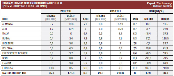 mal grubunda, 2017 yılının Ocak-Mart döneminde 176,6 milyon dolar değerinde ihracat gerçekleştirilirken, 2018 yılının aynı döneminde bu rakam yüzde 36,4 artışla 240,8 milyon dolara yükseldi. Pompa ve kompresörler ürün grubunda, 2018 yılının Ocak-Mart döneminde en fazla ihracat gerçekleştirilen ülke 57,4 milyon dolarla Almanya oldu. 2017 yılının aynı döneminde bu rakam 40,6 milyon dolardı. Almanya’ya yönelik ihracat yüzde 41,5 arttı. Listenin ikinci sırasında bulunan ABD’ye 2017 yılının Ocak-Mart döneminde 12,4 milyon dolarlık ihracat gerçekleştirilirken, 2018 yılının aynı döneminde bu rakam yüzde 27,9 artışla 15,9 milyon dolar oldu. Üçüncü sırada bulunan İtalya’ya 2017 yılının Ocak-Mart döneminde 6 milyon dolar değerinde ürün ihraç edilirken, 2018 yılının aynı döneminde bu rakam yüzde 37,3 artışla 8,2 milyon dolara yükseldi. Dördüncü sıradaki Rusya’ya 2017 yılının Ocak-Mart döneminde 3,4 milyon dolar değerinde pompa ve kompresör ihraç edilirken, 2018 yılının aynı döneminde bu rakam yüzde 110,5 artışla 7,1 milyon dolar oldu. Beşinci sıradaki İngiltere’ye 2018 yılının Ocak-Mart döneminde 7 milyon dolarlık pompa ve kompresör ihraç edildi. 2017 yılının aynı döneminde bu rakam 5,6 milyon dolar seviyesindeydi. İngiltere’ye yönelik ihracat yüzde 23,7 arttı.