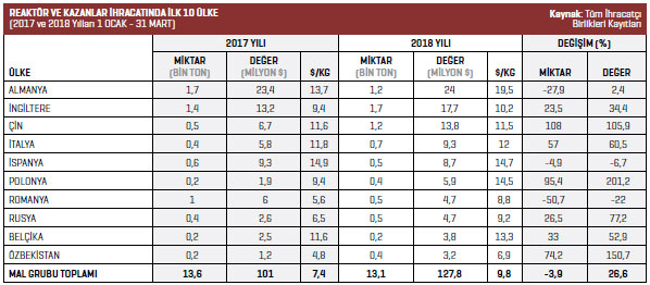 Reaktörler ve kazanlar ihracatı 2017 yılının Ocak-Mart döneminde 101 milyon dolarken, 2018 yılının aynı döneminde bu rakam yüzde 26,6 artışla 127,8 milyon dolar oldu.