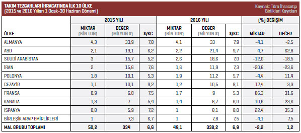 2016 yılının Ocak-Haziran döneminde Türkiye geneli takım tezgahları ihracatı listesinde en fazla artış yüzde 62,8 ile ABD’de yaşandı. İkinci sırada yüzde 35,3 ile İspanya yer alırken üçüncü sırada yüzde 31,6 ile Fransa bulunuyor.