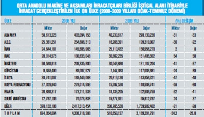 Orta Anadolu Makine ve Aksamları İhracatçıları Birliği iştigal alanına giren GTİP’ler kapsamında belirlenen Türkiye geneli ihracat kayıtlarına göre; 2008 yılı Ocak- Temmuz dönemi ihracat kayıt rakamı 4 milyar 308 milyon dolar iken, bu rakam 2009 yılının eş zaman diliminde yüzde 26 oranında azalarak 3 milyar 189 milyon dolar olarak gerçekleşti. Makine sektörü toplamı, 84. faslın tamamı ve 84. fasıl dışı Orta Anadolu Makine ve Aksamları İhracatçıları Birliğ i iştigal alanı itibariyle 2009 yılı- nın ilk 7 ayında önceki yılın aynı dönemine kıyasla yüzde 27,4 azalarak 4 milyar 904 milyon dolar olarak kaydedildi. Mal grupları bazında incelendiğinde ise; 2008 yılı Ocak-Temmuz döneminde, ihracatında en yüksek artış gerçekleşen kalemler ise yüzde 20,4 ile Savunma Sanayi için Silah ve Mühimmat, yüzde 12,6 ile Hadde ve Döküm Makineleri, Kalıplar yüzde 4,4 ile Yük Kaldırma, Taşıma ve İstifleme Makineleri olmuştur. 2009 yılı Ocak- Temmuz dönemi ihracatında en fazla gerileme görülen mal grupları ise; Endüstriyel Yıkama ve Kurutma Makineleri, İnşaat ve Madencilik Makineleri ve Rulmanlar olarak sıralanıyor. OAİB iştigal alanına giren ürünler itibariyle, mal gruplarının sektör ihracatından aldıkları paylar incelendiğinde ise; 2009 yılı Ocak-Temmuz döneminde; yüzde 12,8 pay ile Endüstriyel Klimalar ve Soğutma Makineleri birinci, yüzde 11 pay ile İnşaat ve Madencilikte Kullanılan Makineler ikinci ve 8,3 pay ile Takım Tezgâhları üçüncü sırada yer alıyor.