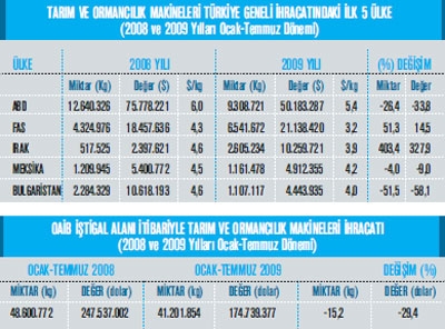 Türkiye tarım ve ormancılık makineleri ihracatı 2008’in Ocak-Temmuz döneminde yüzde 29,4 oranında gerileme göstererek, bu mal grubunda geçtiğimiz yıl 247 milyon 537 bin dolar olan ihracat düzeyi 174 milyon 739 bin dolara düştü. Tarım ve ormancılık makinelerinde en çok ihracat gerçekleştirdiğ imiz ülkenin ise ABD olduğ u görülüyor. Söz konusu ülkeye 2008 yılının Ocak-Temmuz döneminde 75 milyon 778 bin dolarlık tarım ve ormancı- lık makineleri ihracatı söz konusu iken 2009 yılının aynı dönemine gelindiğinde bu değ er yüzde 33,8 oranında gerileme kaydederek 50 milyon 183 bin dolar olmuş. 2008 Ocak-Temmuz döneminde tarım ve ormancı lık makineleri ihracatı- mızda ikinci en büyük pazarı- nın ise Fas olduğu görülüyor. Fas’a gerçekleştirdiğimiz tarım ve ormancılık makineleri ihracatı mız 2008 yılının Ocak-Temmuz döneminde 18 milyon 457 bin dolar iken yüzde 14,5 oranı nda artışla bu değ er 21 milyon 138 bin dolara yükseldi. Tarım ve ormancılık makineleri ihracatımızdaki üçüncü en büyük pazarın ise Irak. Söz konusu ülkeye 2008 yılının Ocak- Temmuz döneminde 2 milyon 397 bin dolar tarım ve ormancı lık makineleri ihracatı yapılmı şken 2009 yılının aynı döneminde yüzde 327,9’luk yükselişle 10 milyon 259 bin dolarlık tarım ve ormancılık makineleri ihracatı yapıldı. Meksika’da tarı m ve ormancılık makineleri ihracatımızın biraz gerileme gösterse de önemli pazarlarından biri olarak dikkat çekiyor. Meksika’ya gerçekleştirdiğimiz tarım ve ormancılık makineleri ihracatımız 2008 yılının Ocak- Temmuz döneminde 5 milyon 400 bin dolar iken yüzde 9 oranı nda gerileme ile bu uzak ülkeye 4 milyon 912 bin dolarlık tarım ve ormancılık makineleri ihracatı yapıldı. Bulgaristan ise tarım ve ormancılık makineleri ihracatımızın en fazla olduğu beşinci ülke konumunda. Bulgaristan’a 2008 yılının Ocak-Temmuz döneminde 10 milyon 618 bin dolarlık tarım ve ormancılık makineleri ihracatı yapan fialarımız 2009 yılının aynı zaman dilimine gelindiğ inde yarı yarıya bir ihracat azalması olsa da 4 milyon 443 bin dolarlık tarım ve ormancı lık makineleri ihracatı yapmayı başardılar. Tarım ve ormancılık makinelerinde en fazla artışın olduğu ülke Irak ise yüzde 327,9 oranı nda yükselişle dikkat çekiyor.