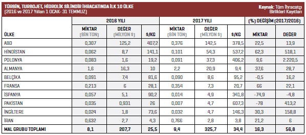 Türbin, turbojet, hidrolik silindir ihracatı 2017 yılının Ocak-Temmuz döneminde 325,7 milyon dolar olarak kaydedildi. 2016 yılının aynı döneminde bu rakam 207,7 milyon dolardı. Türbin, turbojet, hidrolik silindir ürün grubundaki ihracat artışı yüzde 56,8 olarak kaydedildi. Türbin, turbojet, hidrolik silindir kaleminde 2017 yılının Ocak-Temmuz döneminde en fazla ihracat gerçekleştirilen ülke 142,5 milyon dolarla ABD oldu.