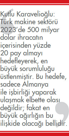 Dünyanın en önemli pazarlarından biri olsa dahi, Almanya’yı sadece  Almanya’dan ibaret göremeyiz diyen Karavelioğlu, “Büyük pazarlarda üretim yapmanın en büyük avantajı, firmaların büyümesinin daha kolay oluşu, daha ekonomik ve rekabetçi üretim yapabilmeleridir.Türk makine sektörü 2023’te hedeflenen 500 milyar dolar ihracatın içerisinden yüzde 20 pay almayı hedefleyerek, en büyük sorumluluğu üstlenmiştir. Bu hedefe, sadece Almanya ile işbirliği yaparak ulaşmak elbette olası değildir; fakat en büyük ağırlığın bu ilişkide olacağı bellidir”dedi.Karavelioğlu, en büyük müşterimiz Almanya, yani dünyanın ikinci büyük makine ihracatçısı, bizim potansiyelimizden en çok yararlanan ülkedir. Almanya,giderek bilgi yoğun alanlara kaysa da, ülke içinde ve dışında makine imalatına en büyük yatırımları yapan ülkelerdendir. Almanya’nın Türkiye’ye verdiği önem, daha doğrusu sergilediği farkındalık, diğer bütün ülkelerden yüksektir, ifadelerini kullandı.