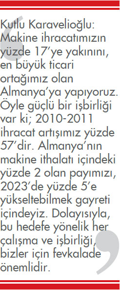 Biz, makine ihracatımızın yüzde 17’ye yakınını, en büyük ticari ortağımız olan Almanya’ya yapıyoruz. 2 milyar dolar kadar. Öyle güçlü bir işbirliği var ki; çarpıcı olması bakımından sadece bir dönemi vereceğim: 2010- 2011 ihracat artışımız yüzde 57’dir. Almanya’nın makine ithalatı içindeki yüzde 2 olan payımızı, 2023’de yüzde 5’e yükseltebilmek gayreti içindeyiz. Dolayısı ile, bu hedefe yönelik her çalışma ve işbirliği, bizler için fevkalade önemlidir.”