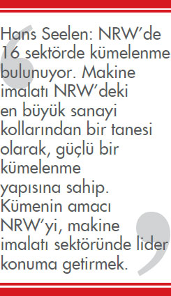 Seelen, “Sektörün verimliliğinin muhafaza edilmesi ve artırılması, sektörün menfaatlerinin bir araya getirilmesi ve uygulanmasının sağlanması, lokasyonun gücünün ve potansiyelinin geliştirilmesi, aktörler arasında çalışma ağı oluşturulmasını hedefliyoruz” dedi. NRW Eyaleti Ekonomi, Enerji, Sanayi, KOBİ ve Zanaat Bakanlığı yetkilisi Dr. Johannes Bauerdick, NRW’nin Avrupa’nın önemli ekonomik merkezlerinden biri olduğunu kaydederek, 2011 yılında İtalya, İngiltere ve Fransa gibi ülkelerin sanayi  çalışmaları bakımından NRW’nin gerisinde kaldığını bildirdi. “En büyük dalımız makine imalatıdır. 2012’deki ciromuz 50 milyar eurodan biraz düşüktür” diyen Bauerdick, makine sektörünün arkasından kimya sanayi ve metal üretim ve işlemenin geldiğini dile getirdi. NRW’nin makine sektöründe öncü rolüne dikkat çeken Bauerdick makine imalatı yapan bin 500 kadar işletme olduğunu, bu işletmelerde 204 bin kişinin çalıştığını ifade etti.