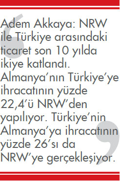 NRW Invest Germany Türkiye Temsilcisi Dr. Adem Akkaya ise, NRW Invest’in 5 yıldır Türkiye’de faaliyet gösterdiğini belirterek, “Almanya’daki yabancı yatırımcılar, Avrupa pazarlarına giriş kapısı olarak burayı tercih ediyor” dedi. Akkaya, hasılatı en yüksek 50 Alman firmasından 19’unun merkezinin NRW’de bulunduğunu kaydetti. Makine üreticileri ve tedarikçileri için en cazip yatırım bölgesinin NRW olduğunu ve sektörün 2012’deki cirosunun 48,5 milyar euro olduğunu belirten Akkaya, NRW ile Türkiye arasındaki ticaretin son 10 yılda ikiye katlandığını dile getirerek “Almanya’nın Türkiye’ye ihracatının yüzde 22,4’ü NRW’den yapılıyor. Türkiye’nin Almanya’ya ihracatının yüzde 26’sı NRW’ye gerçekleşiyor” dedi. NRW’nin Türk firmaları için en mükemmel